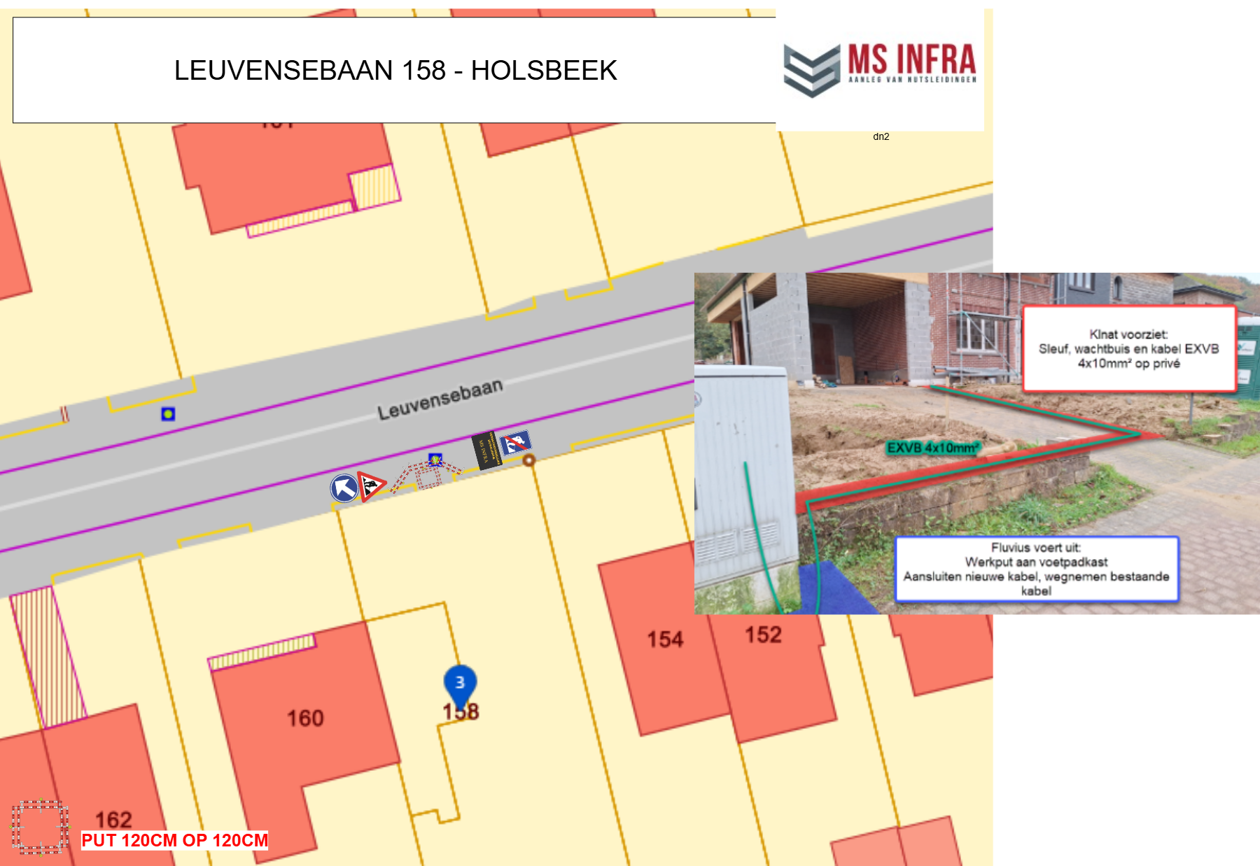 ● Op 5 november 2025 werd de aanvraag van MS-Infra ontvangen voor het plaatsen van verkeerstekens langs Leuvensebaan 158.